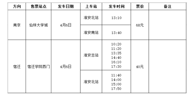 为方便广大淮安学子“清明”假期便捷返校,我公司开通多条校园直通车,实行“点到点、一站式”运输,现将具体班次信息通告如下: 校园直通车班次信息表 各位旅客可通过以下渠道购票、查询: 1. 手机扫描下方二维码,或查找公众号“淮汽集团”,关注后进行微信购票。 2. 手机扫描下方二维码,下载“巴士官家”APP手机购票、巴管微信小程序。 3. 车站自助售票机及售票窗口。 1. 淮安汽车南、北、总、高铁汽车站的省际、市际班线已实行实名制购票、乘车,请务必携带本人有效身份证件。 2. 通过线上购票的朋友,均可凭身份证、条形码或订单信息直接检票乘车,无须换取正式车票。如需纸质车票报销,可凭取票号密码在售票大厅自助取票机办理取票(自助机支持身份证取票),也可回程顺道取票。