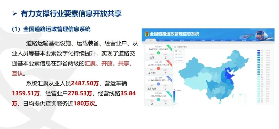 全国道路运政管理信息系统汇聚从业人员2487.50万、营运车辆1359.51万、经营业户278.53万、经营线路35.84万、日均提供查询服务近180万次,为道路运输行业监管数据共享、跨部门数据共享交换提供了有力数据支撑和技术保障。