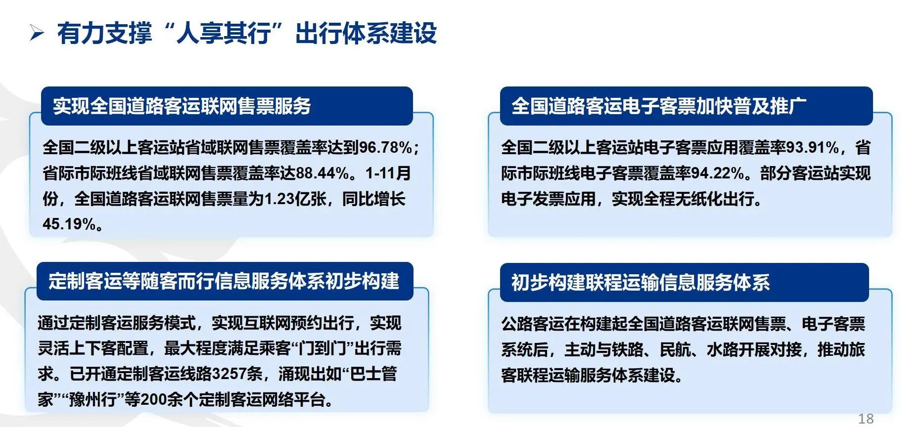 道路运输基础设施、运载装备、经营业户、从业人员等基本要素数字化持续提升,实现了道路交通基本要素信息在部省两级的汇聚、开放、共享、互认。