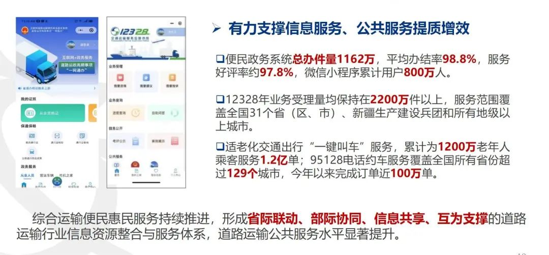 便民政务系统总办件量1162万,平均办结率98.8%,服务好评率约97.8%,微信小程序累计用户800万人。12328年业务受理量均保持在2200万件以上,服务范围覆盖全国31个省(区、市)、新疆生产建设兵团和所有地级以上城市。适老化交通出行“一键叫车”服务,累计为1200万老年人乘客服务1.2亿单;95128电话约车服务覆盖全国所有省份超过129个城市,今年以来完成订单近100万单。实现全国道路客运联网售票服务,二级以上客运站联网售票覆盖率达到96.78%,全国二级以上客运站电子客票应用覆盖率超过90%,全程无纸化出行。定制客运等随客而行信息服务如“巴士管家”“豫州行”等200余个定制客运网络平台,联程运输信息服务保障旅客跨运输方式出行便捷高效。