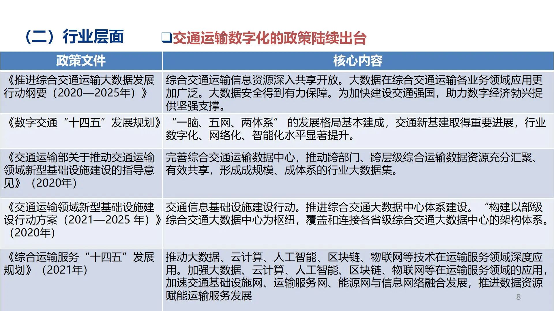 《交通强国建设纲要》明确提出要大力发展智慧交通,推进数据资源赋能交通发展,加速交通基础设施网、运输服务网、能源网与信息网络融合发展,构建综合交通大数据中心体系,深化交通公共服务和电子政务发展。《国家综合立体交通网规划纲要》特别强调要推进综合交通高质量发展,提升智慧发展水平,构建综合交通大数据中心体系,完善综合交通运输信息平台。