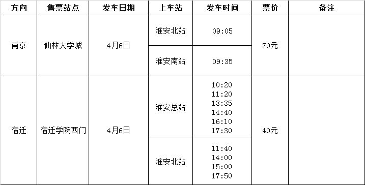 为方便广大淮安学子“清明”假期便捷返校,我公司开通多条校园直通车,实行“点到点、一站式”运输,现将具体班次信息通告如下: 校园直通车班次信息表