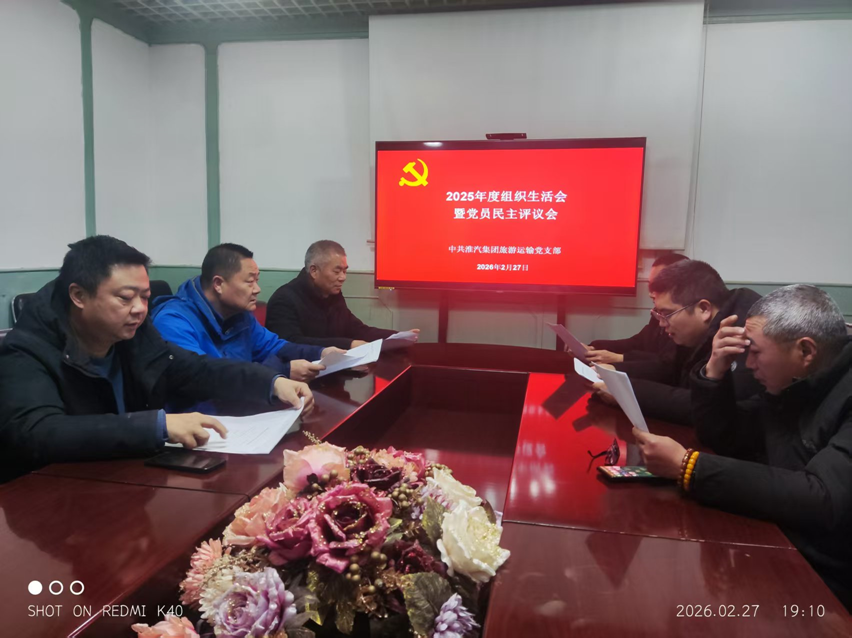 2026年2月27日晚,中共淮汽集团旅游运输党支部在淮安汽车总站第六会议室召开2025年度组织生活会暨党员民主评议会。支部全体党员参加会议,会议由支部书记时海军主持。 会上,支部书记首先代表支部班子作对照检查,深入查摆了支部在政治建设、思想建设、组织建设、作风建设、纪律建设等方面存在的问题,深刻剖析了问题产生的根源,并明确了整改措施和努力方向。随后,支部党员逐一进行个人对照检查发言,大家紧密联系思想和工作实际,严肃开展批评与自我批评。 在民主评议党员环节,全体党员本着实事求是、客观公正的原则,对照党员标准,对支部党员进行了民主测评,进一步强化了党员的身份意识和责任担当。此次组织生活会和民主评议会的召开,有效增强了支部的凝聚力和战斗力,为推动旅游运输党支部各项工作高质量发展奠定了坚实的思想和组织基础。